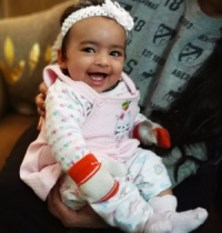 “ 'Her name is Samayra. She is 4months old. She has attractive and brown eyes and cute smile.Her hairs are short. She just started calling na na na na recently. She love gathering and recognizes her parents. Remains happy nad make people around happy.' ”