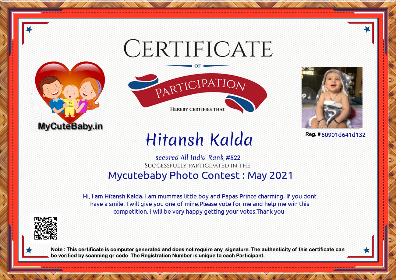 Participation certificate for all the participants whose mycutebaby votes are more than 1000.
