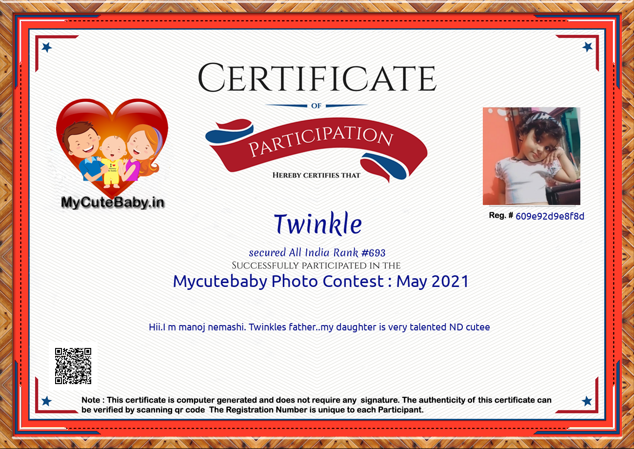 Participation certificate for all the participants whose mycutebaby votes are more than 1000.
