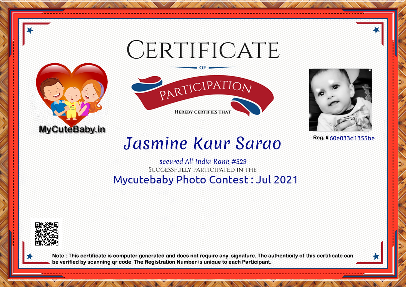 Participation certificate for all the participants whose mycutebaby votes are more than 1000.