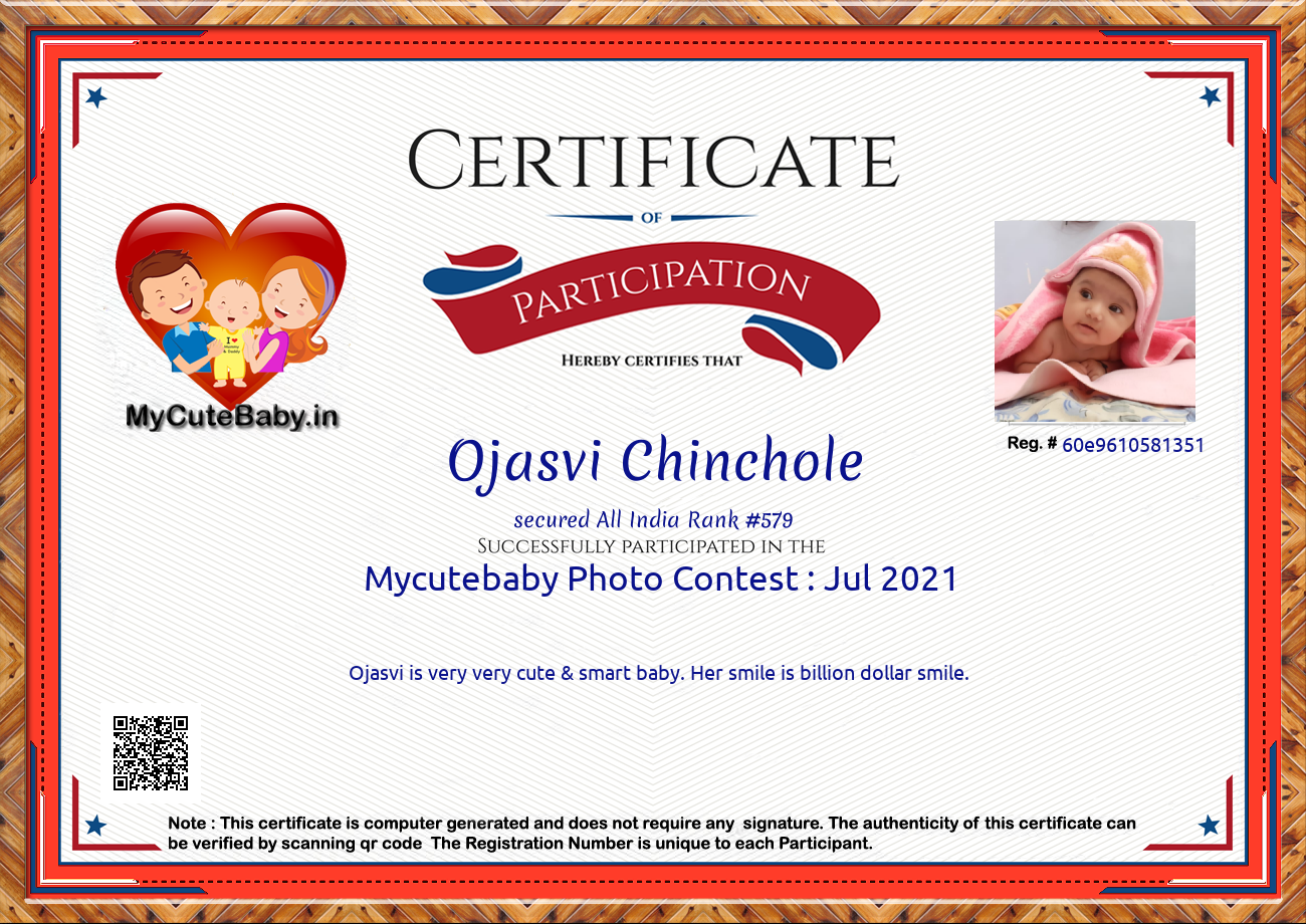 Participation certificate for all the participants whose mycutebaby votes are more than 1000.