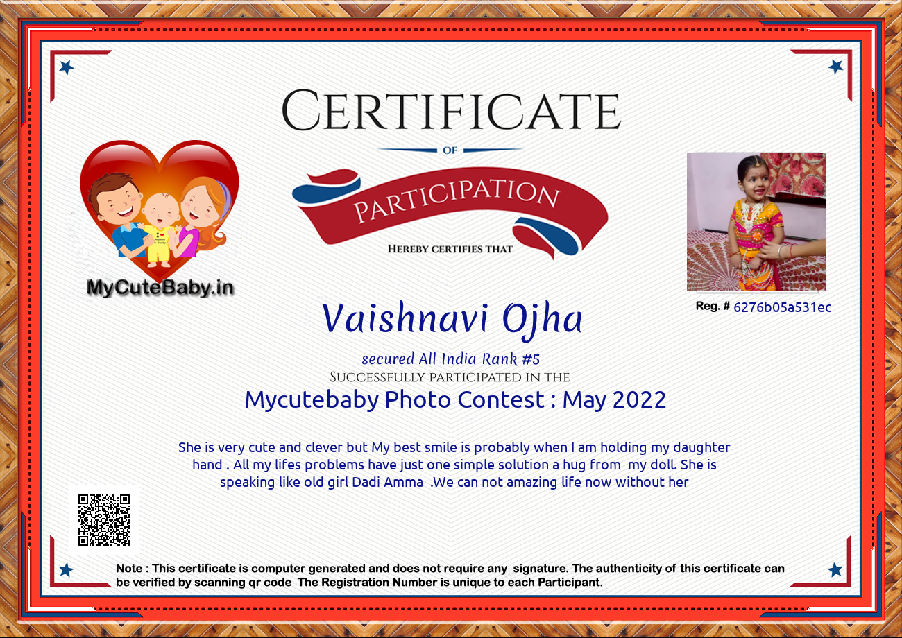 Participation certificate for all the participants whose mycutebaby votes are more than 1000.