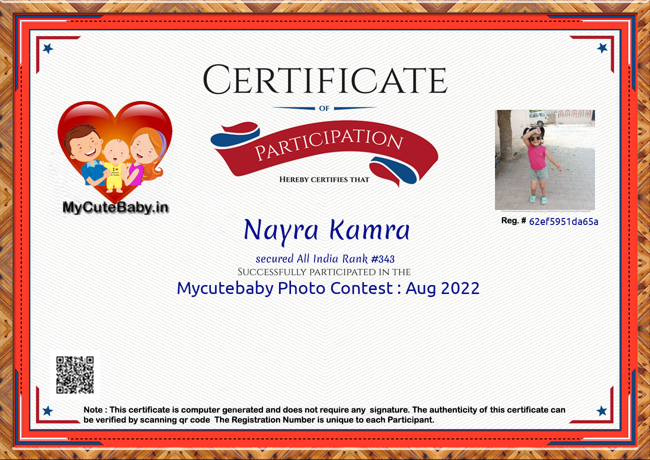 Participation certificate for all the participants whose mycutebaby votes are more than 1000.