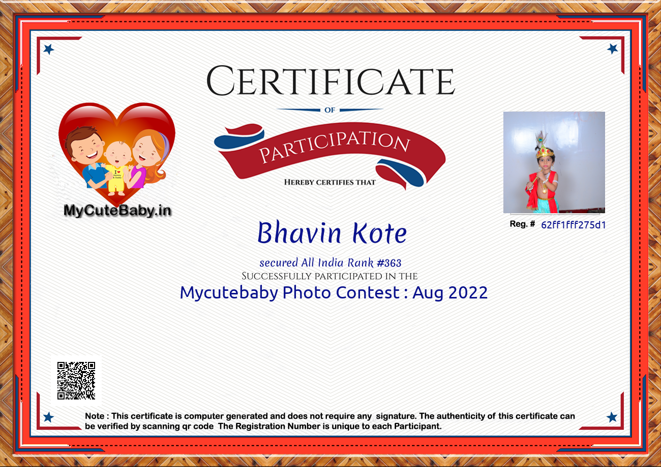 Participation certificate for all the participants whose mycutebaby votes are more than 1000.