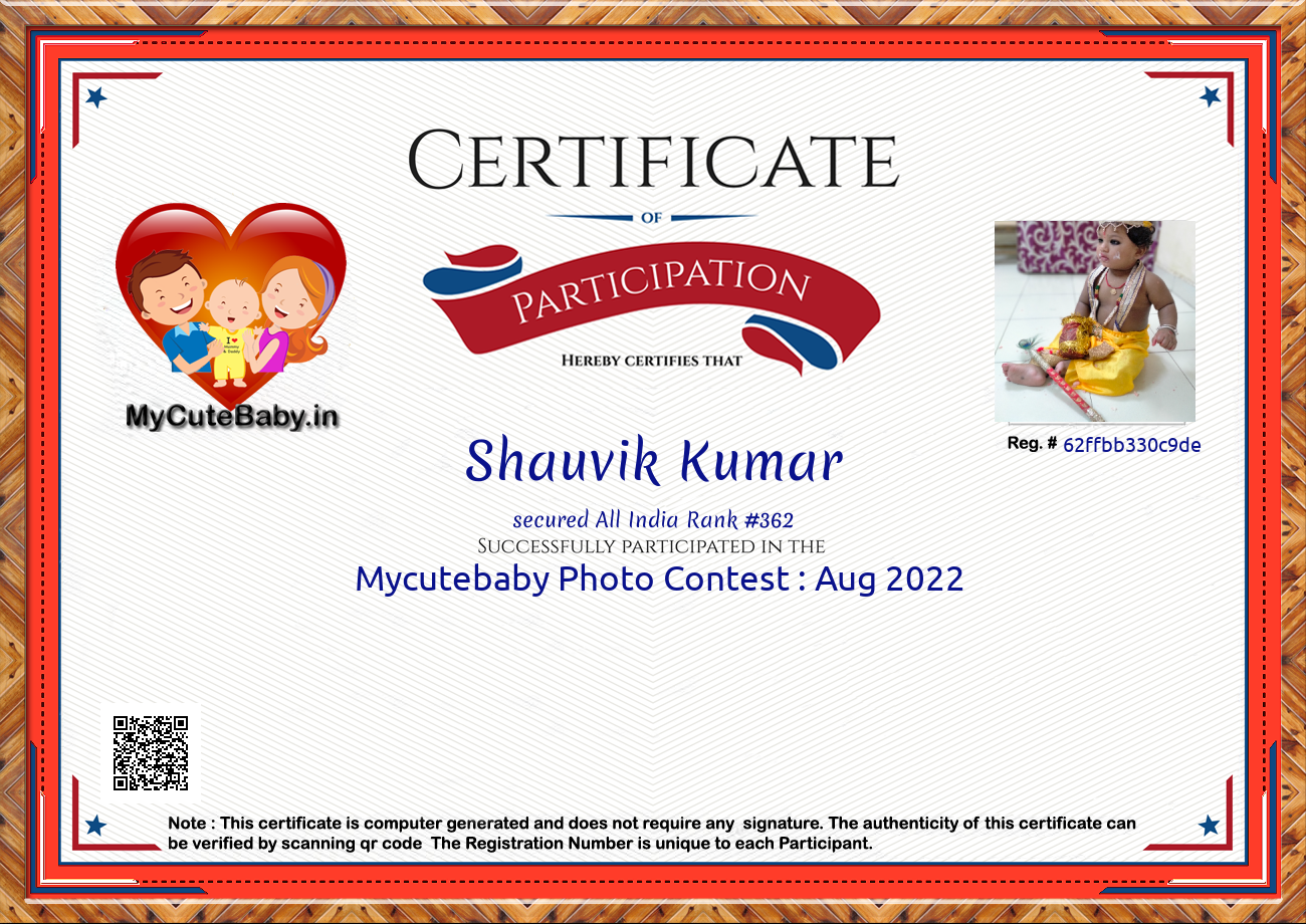 Participation certificate for all the participants whose mycutebaby votes are more than 1000.