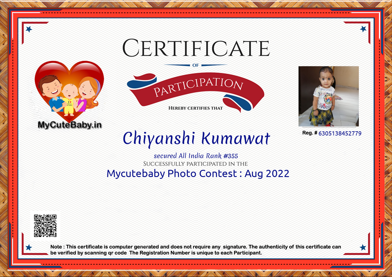 Participation certificate for all the participants whose mycutebaby votes are more than 1000.