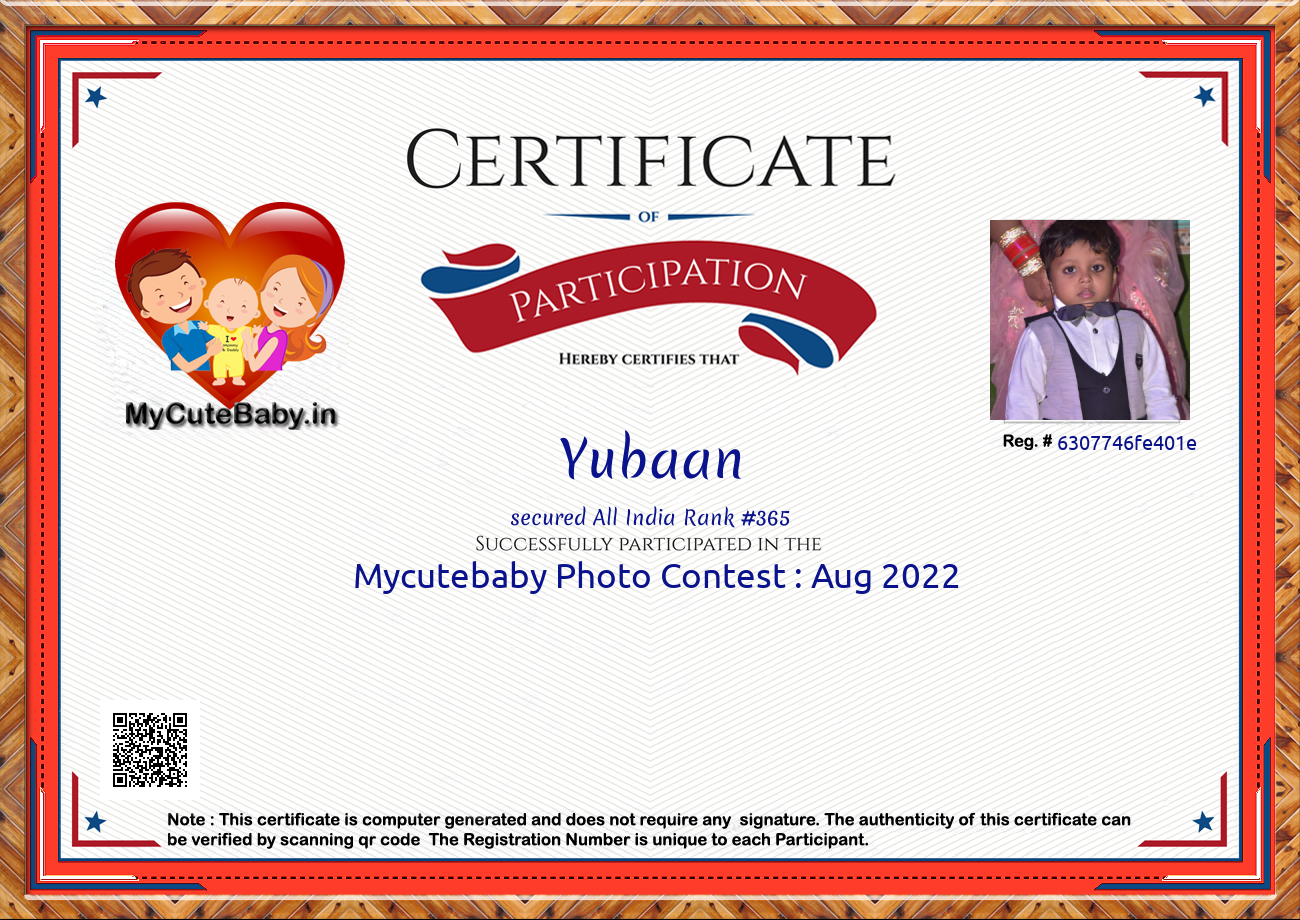 Participation certificate for all the participants whose mycutebaby votes are more than 1000.