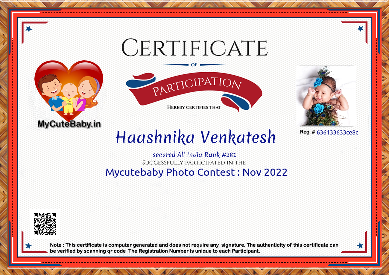 Participation certificate for all the participants whose mycutebaby votes are more than 1000.