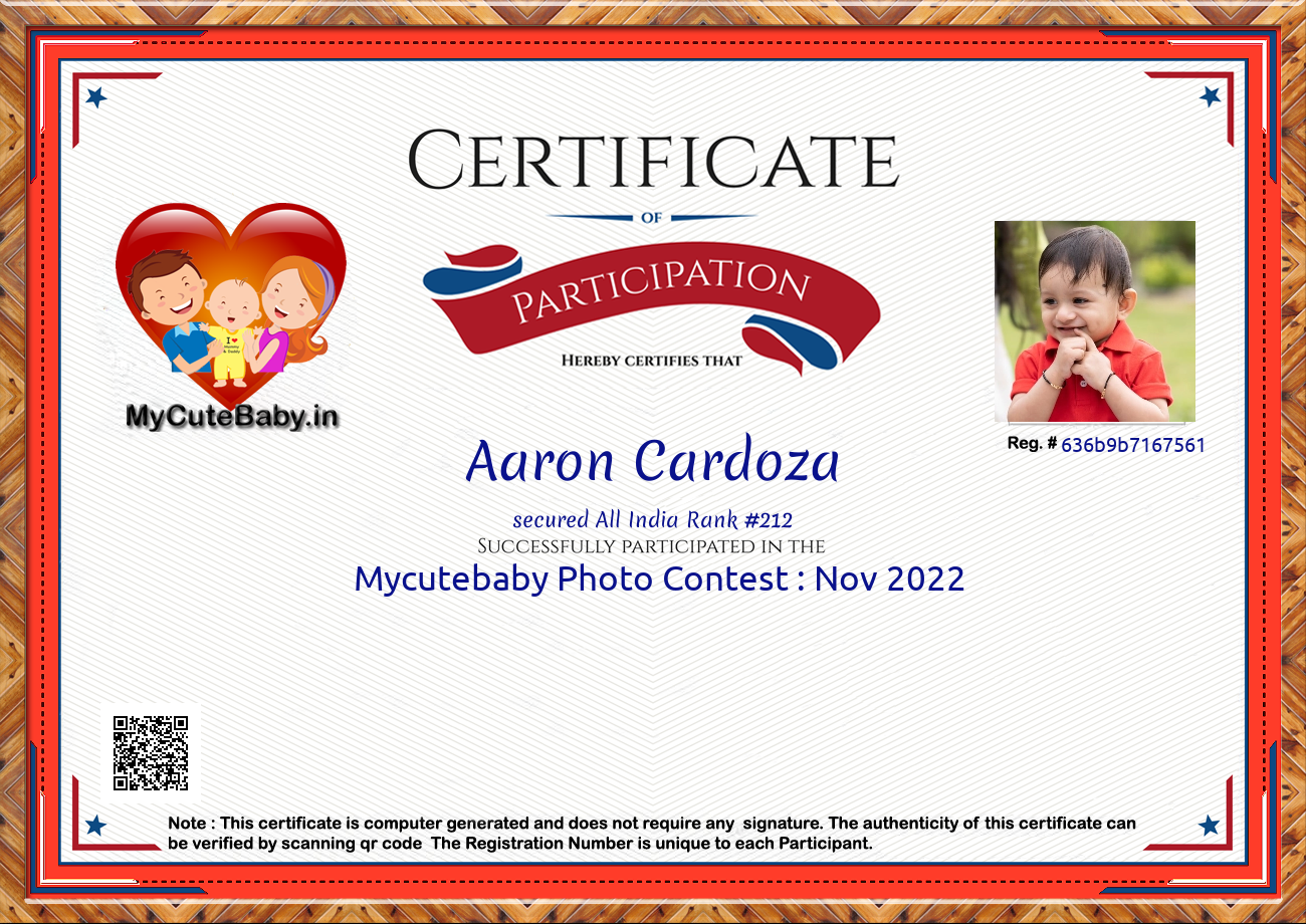 Participation certificate for all the participants whose mycutebaby votes are more than 1000.