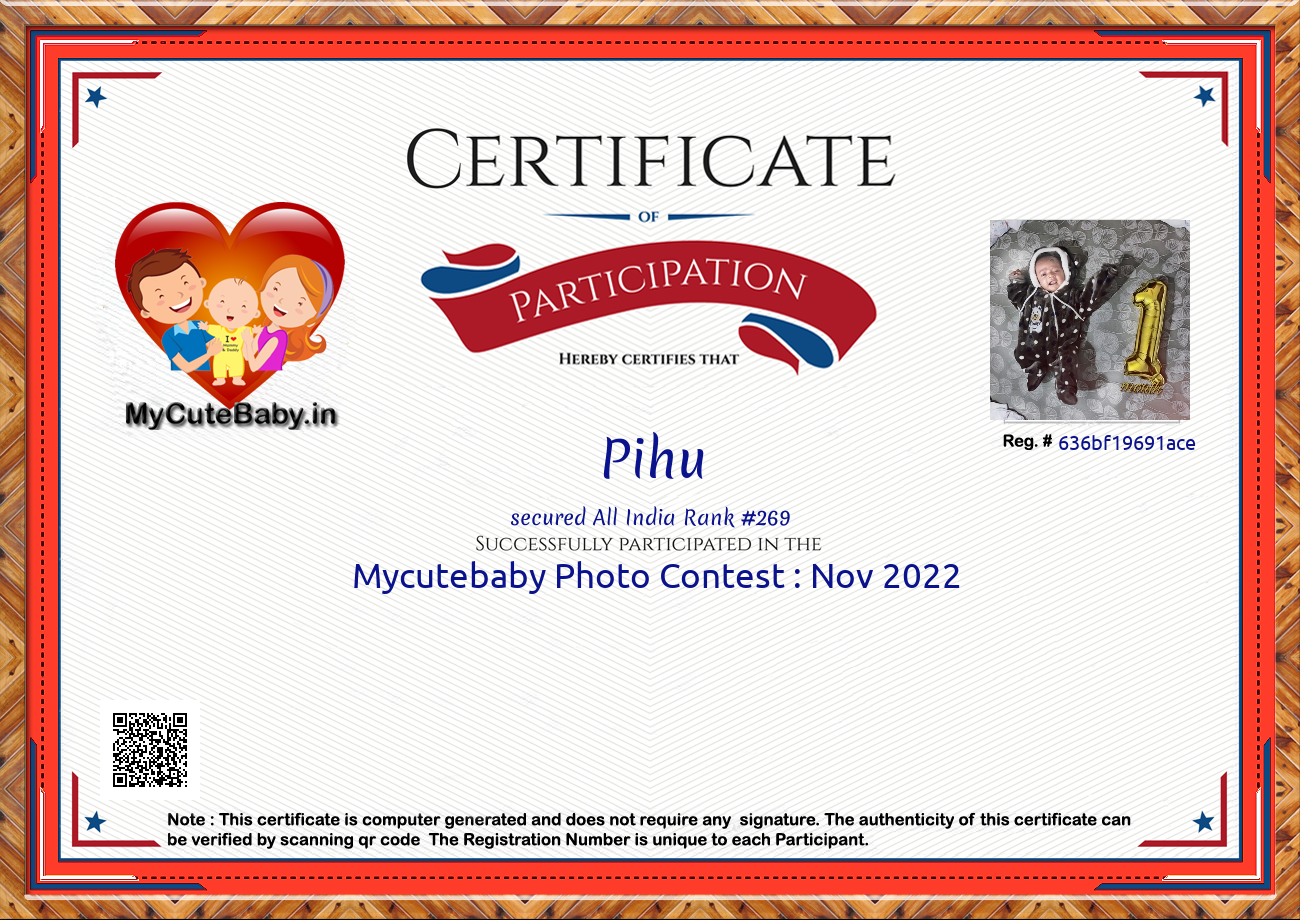 Participation certificate for all the participants whose mycutebaby votes are more than 1000.