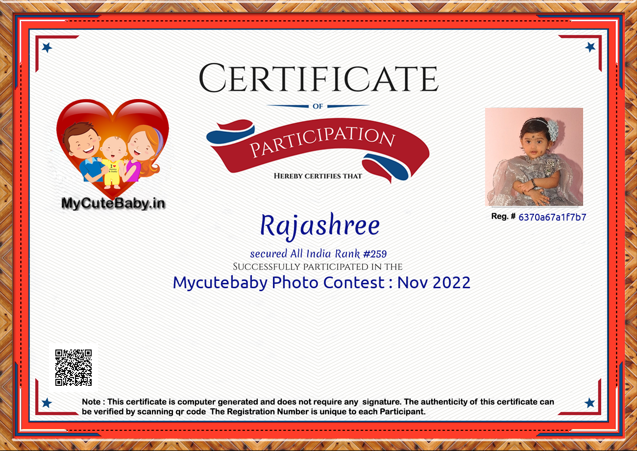 Participation certificate for all the participants whose mycutebaby votes are more than 1000.