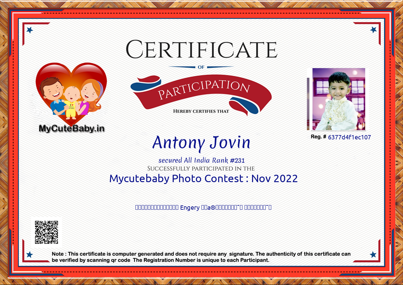 Participation certificate for all the participants whose mycutebaby votes are more than 1000.