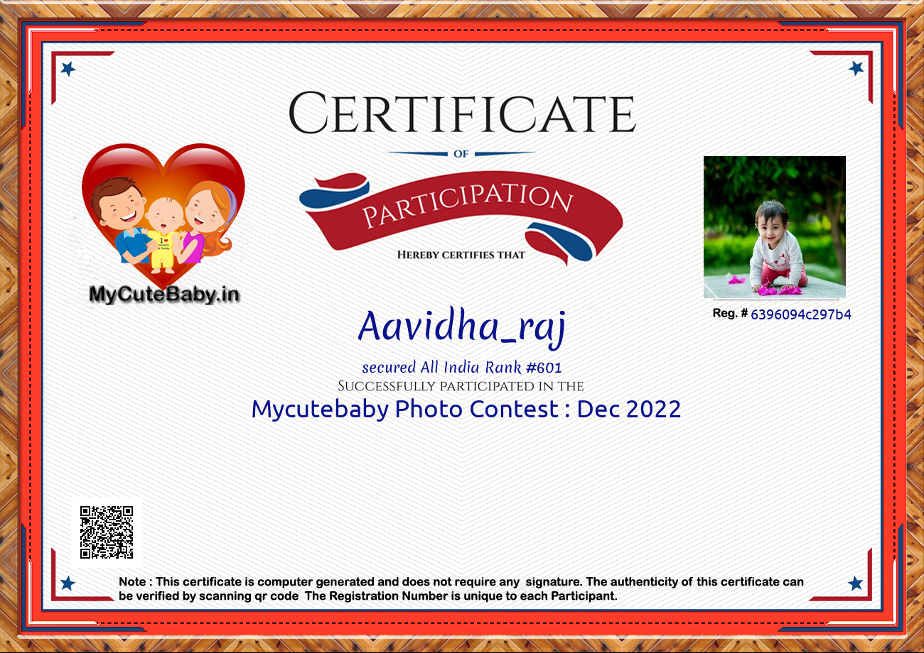 Participation certificate for all the participants whose mycutebaby votes are more than 1000.