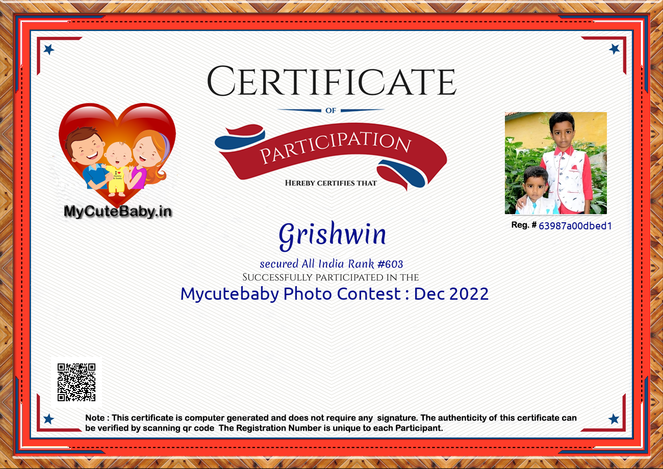 Participation certificate for all the participants whose mycutebaby votes are more than 1000.
