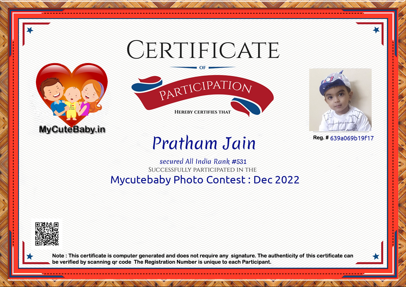 Participation certificate for all the participants whose mycutebaby votes are more than 1000.