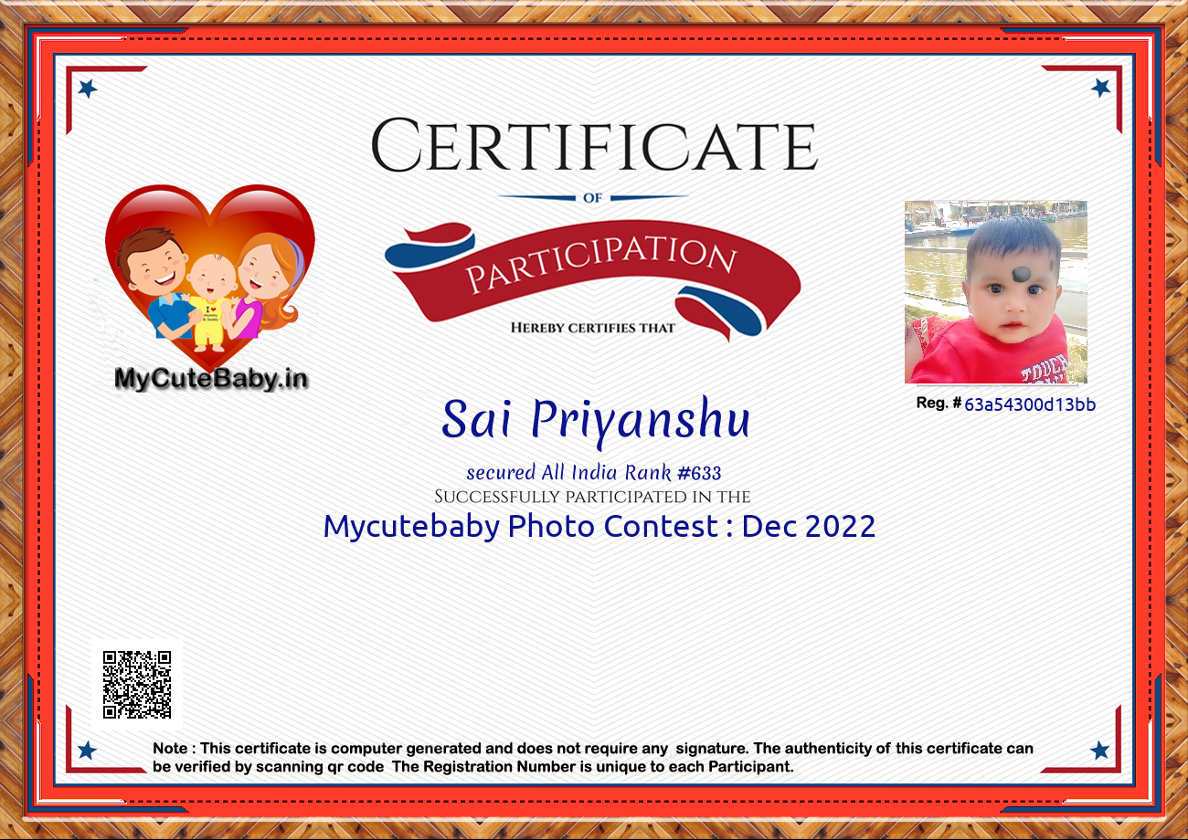 Participation certificate for all the participants whose mycutebaby votes are more than 1000.