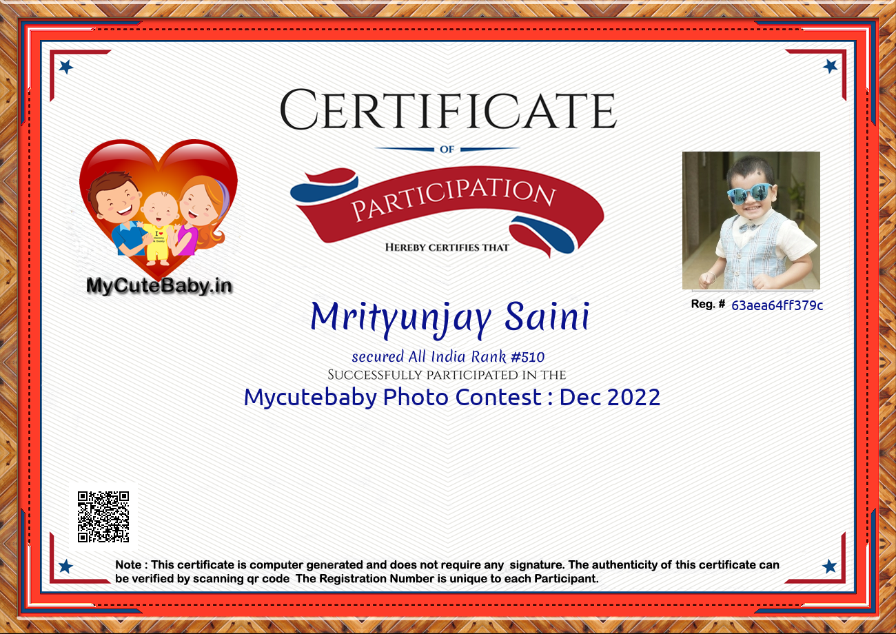 Participation certificate for all the participants whose mycutebaby votes are more than 1000.