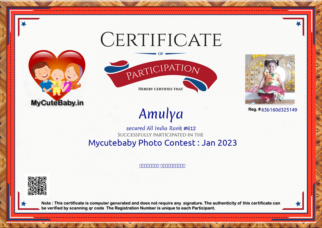 Participation certificate for all the participants whose mycutebaby votes are more than 1000.