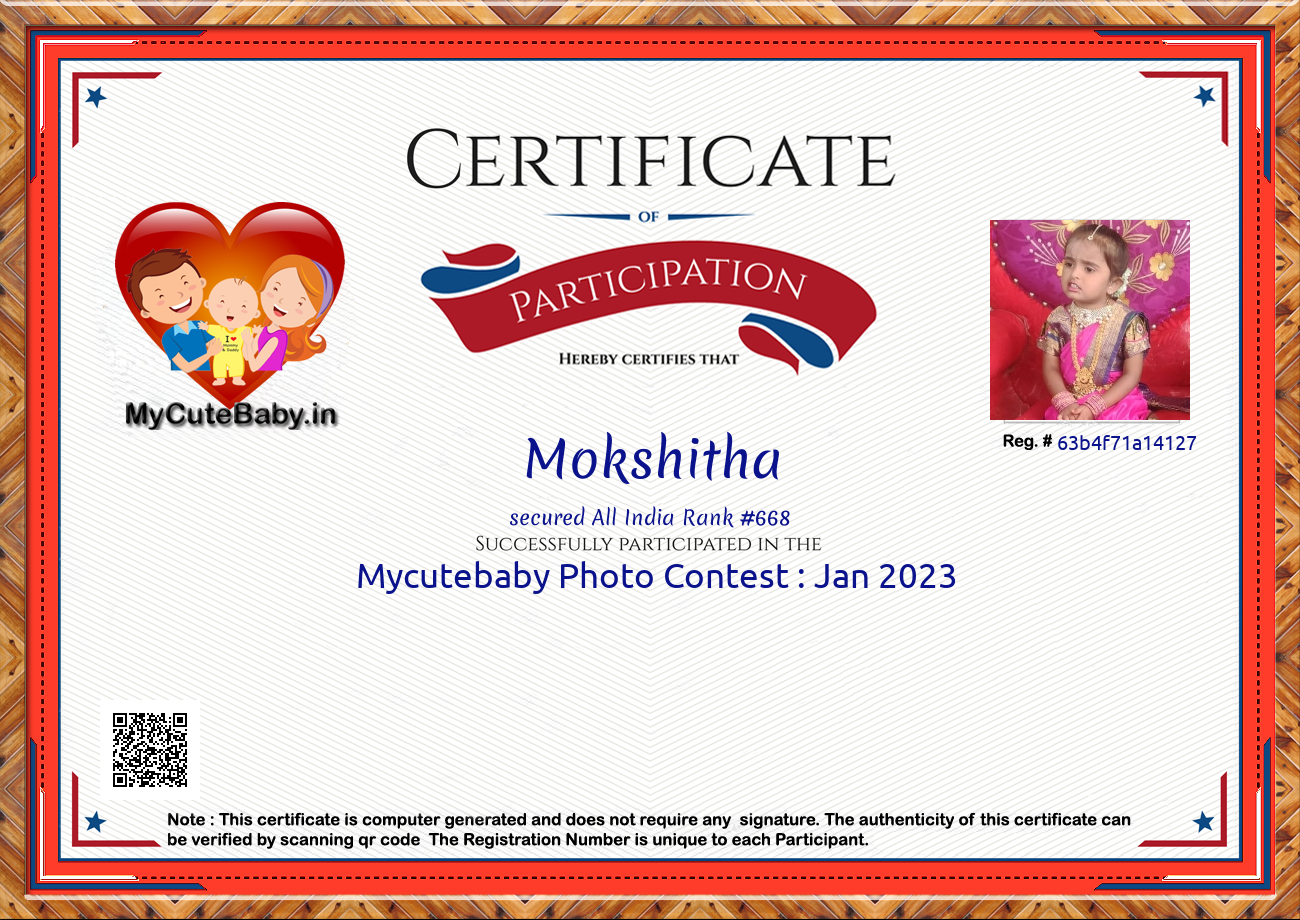Participation certificate for all the participants whose mycutebaby votes are more than 1000.