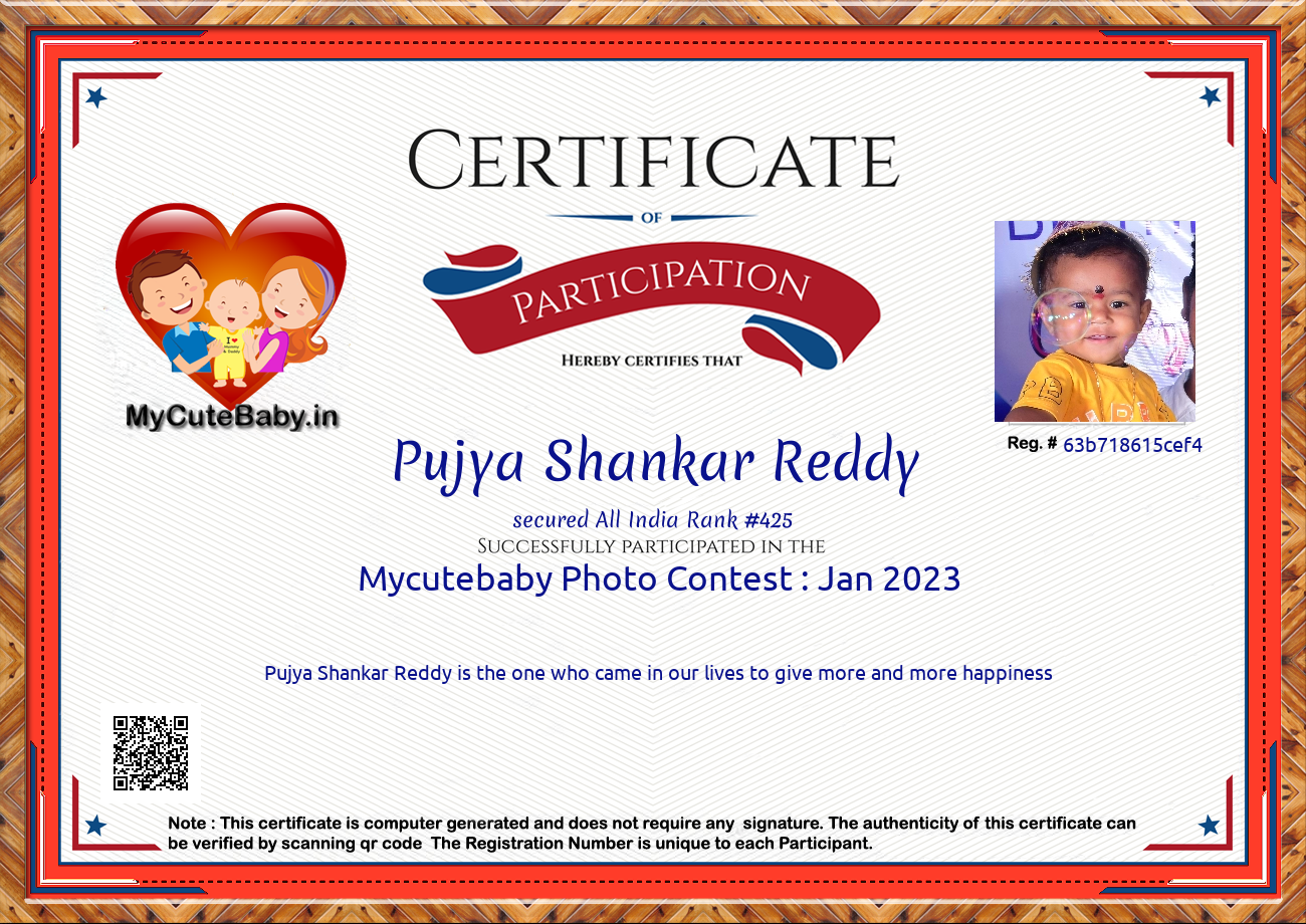 Participation certificate for all the participants whose mycutebaby votes are more than 1000.