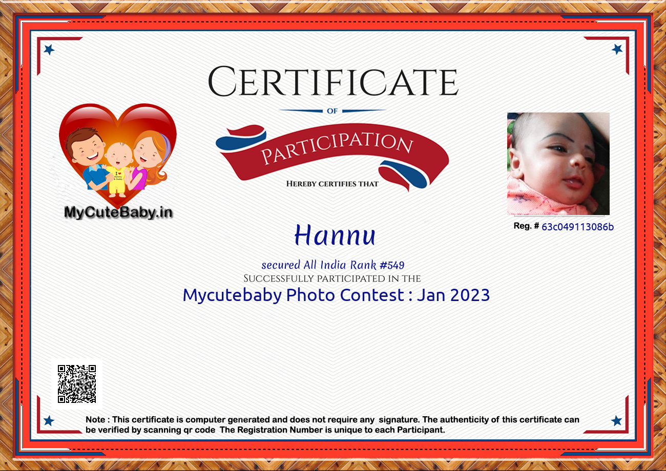 Participation certificate for all the participants whose mycutebaby votes are more than 1000.