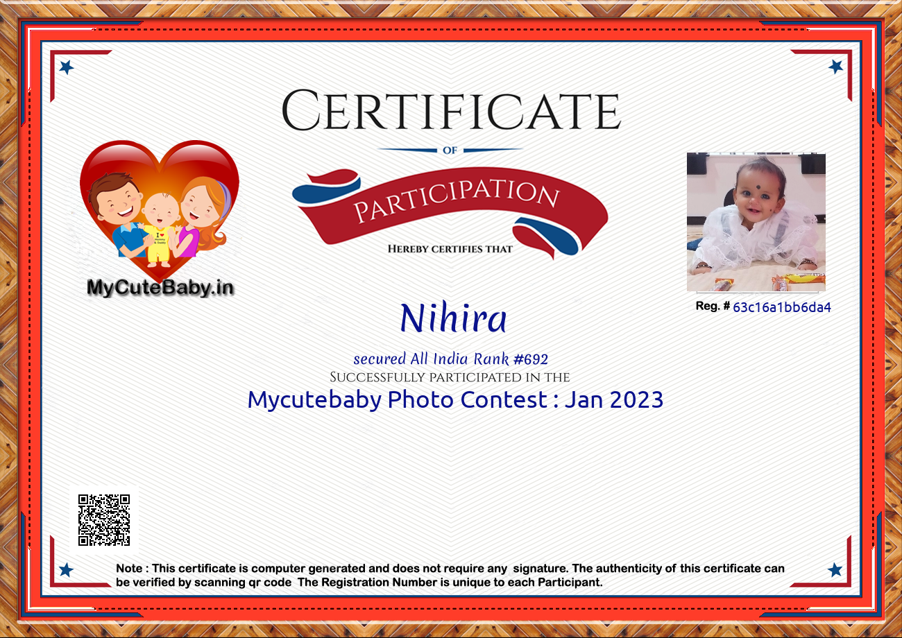 Participation certificate for all the participants whose mycutebaby votes are more than 1000.