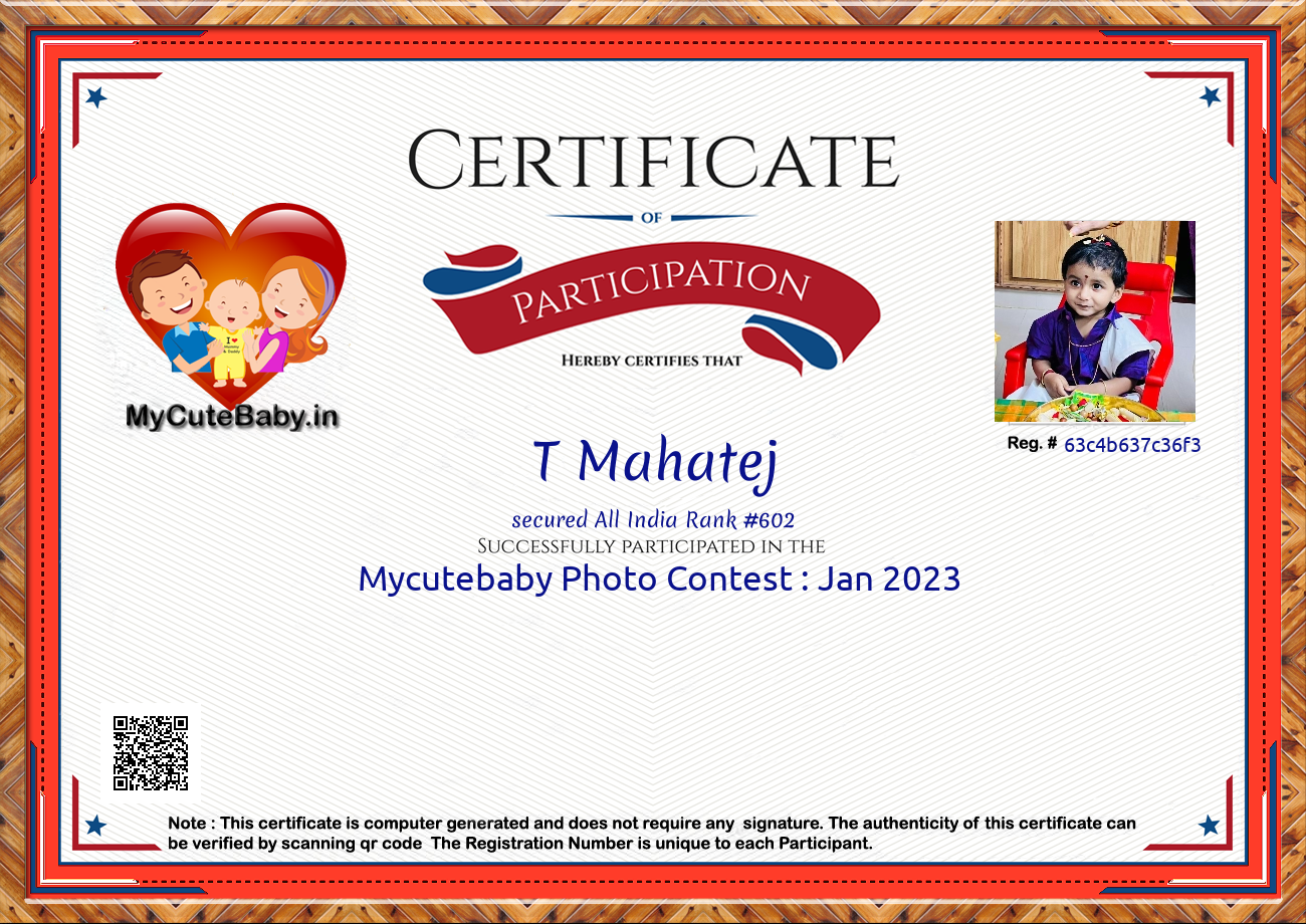 Participation certificate for all the participants whose mycutebaby votes are more than 1000.