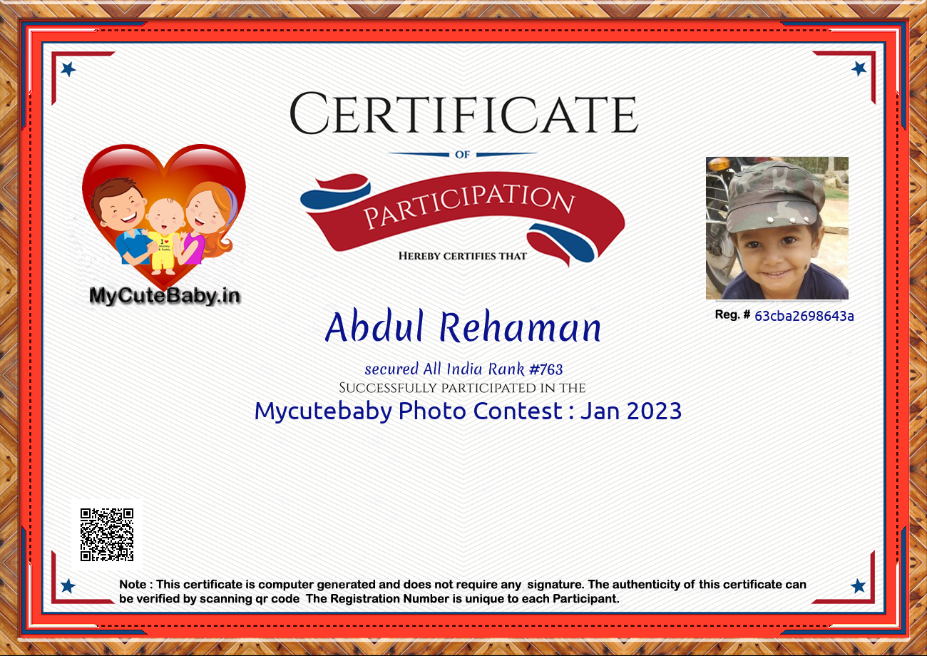 Participation certificate for all the participants whose mycutebaby votes are more than 1000.