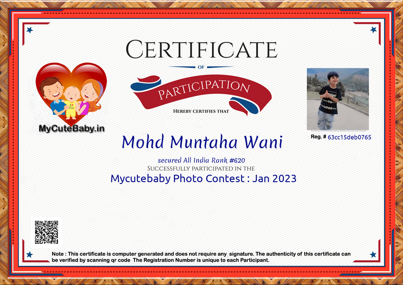Participation certificate for all the participants whose mycutebaby votes are more than 1000.