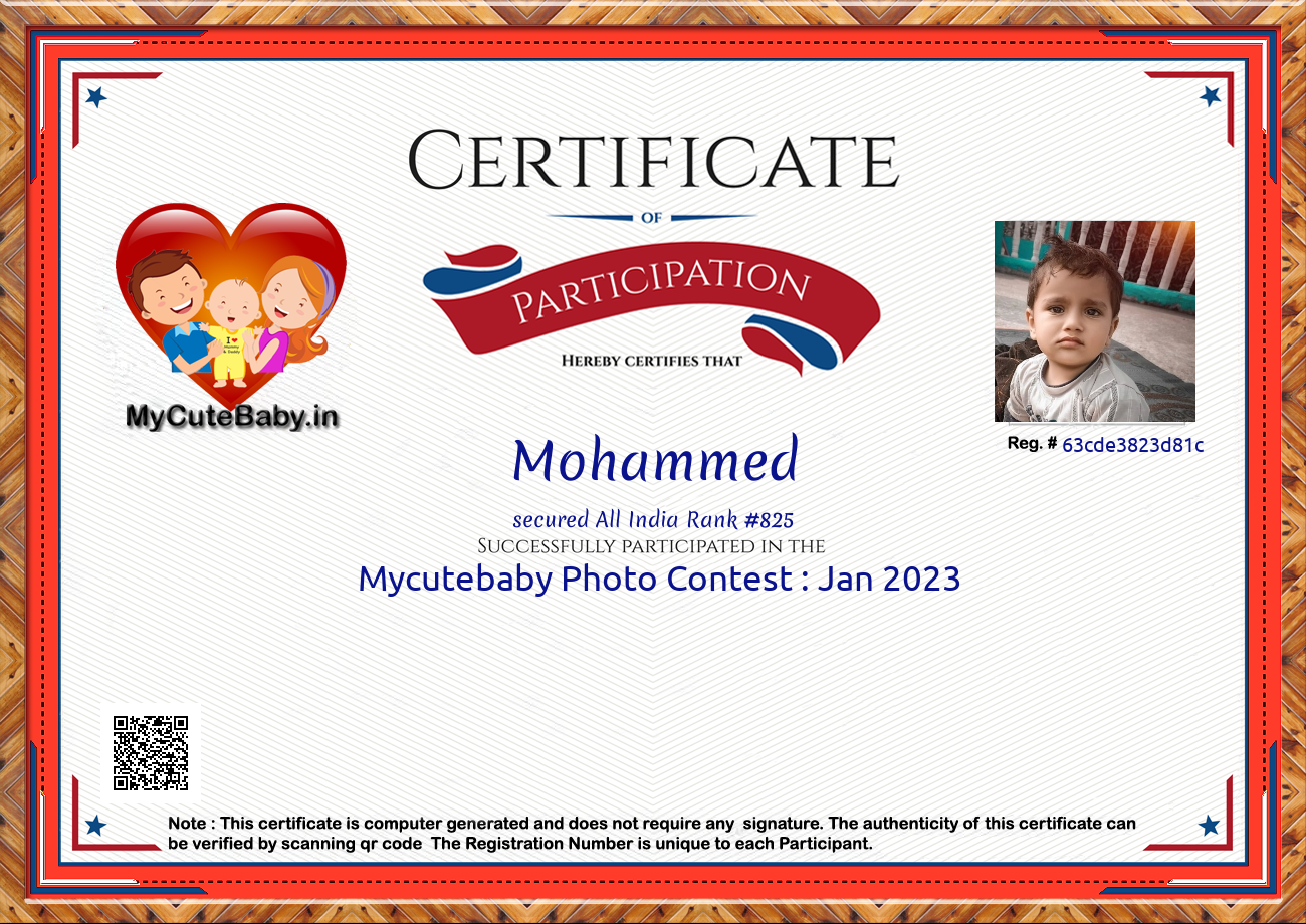 Participation certificate for all the participants whose mycutebaby votes are more than 1000.