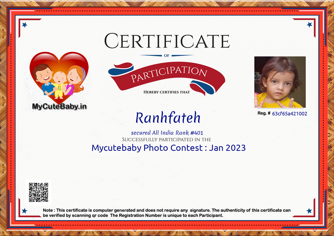 Participation certificate for all the participants whose mycutebaby votes are more than 1000.