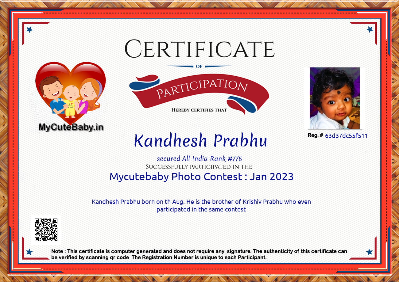 Participation certificate for all the participants whose mycutebaby votes are more than 1000.