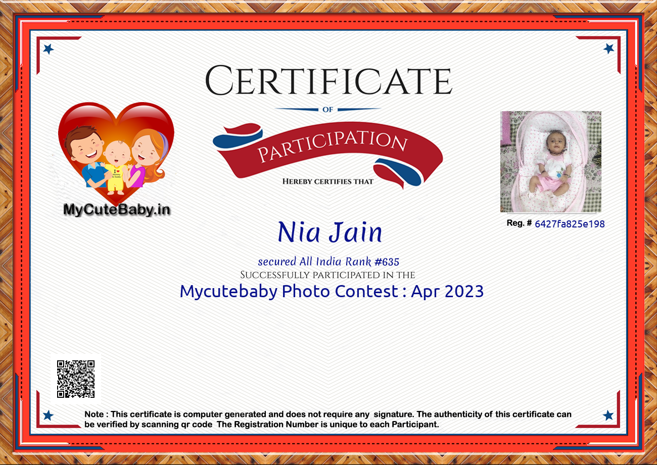 Participation certificate for all the participants whose mycutebaby votes are more than 1000.