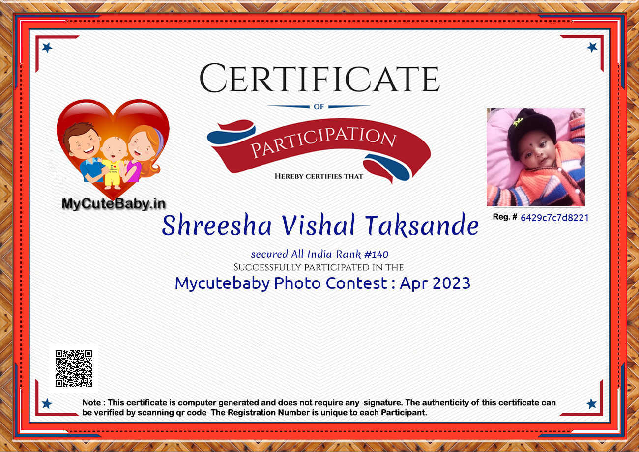 Participation certificate for all the participants whose mycutebaby votes are more than 1000.