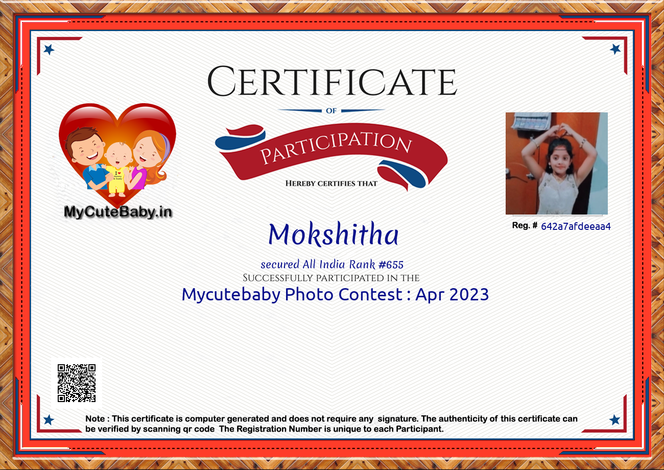 Participation certificate for all the participants whose mycutebaby votes are more than 1000.