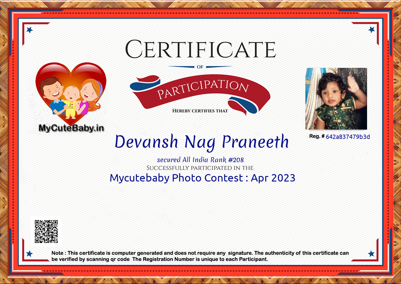 Participation certificate for all the participants whose mycutebaby votes are more than 1000.