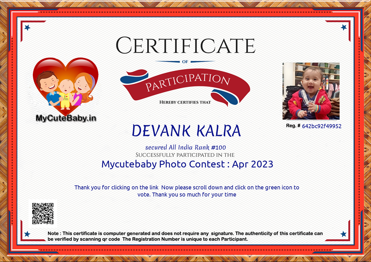Participation certificate for all the participants whose mycutebaby votes are more than 1000.