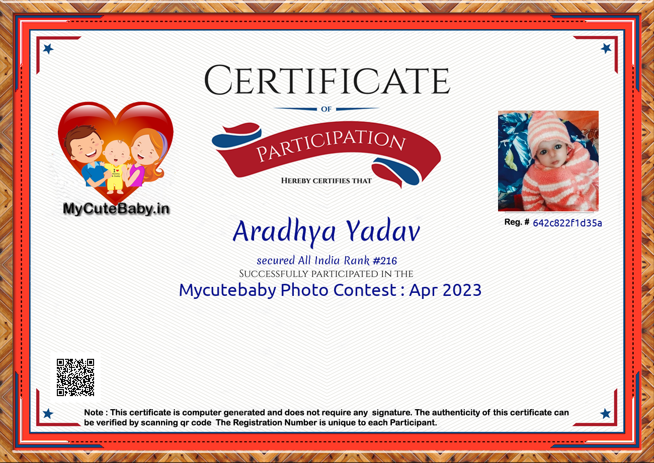 Participation certificate for all the participants whose mycutebaby votes are more than 1000.
