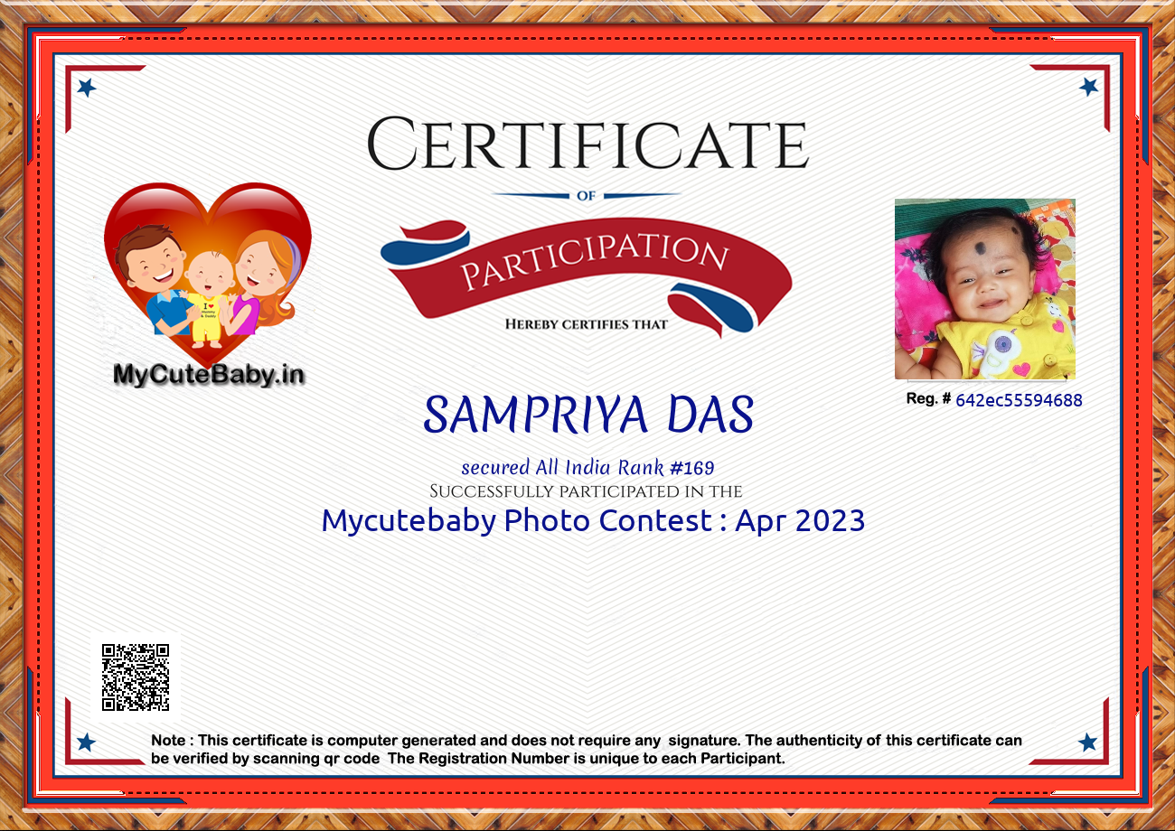 Participation certificate for all the participants whose mycutebaby votes are more than 1000.