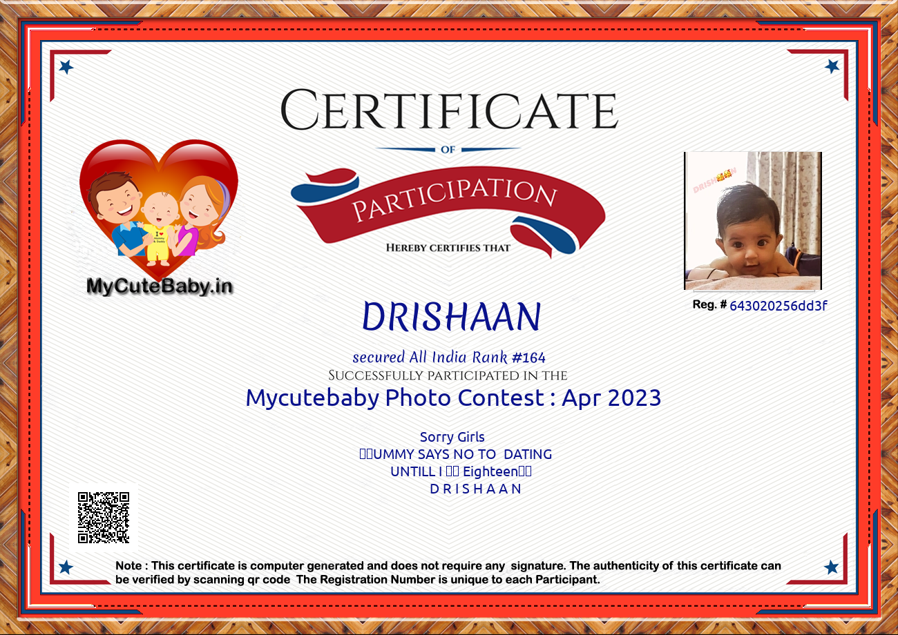 Participation certificate for all the participants whose mycutebaby votes are more than 1000.