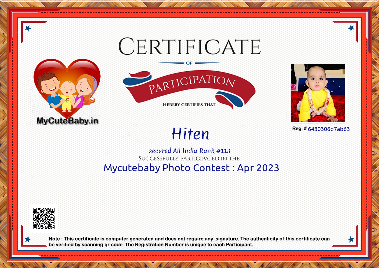 Participation certificate for all the participants whose mycutebaby votes are more than 1000.
