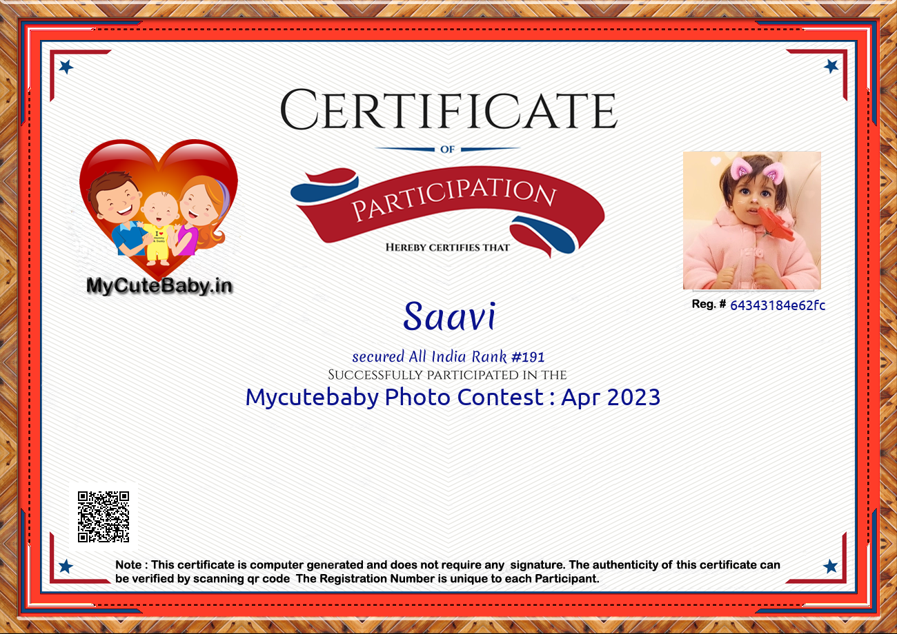 Participation certificate for all the participants whose mycutebaby votes are more than 1000.