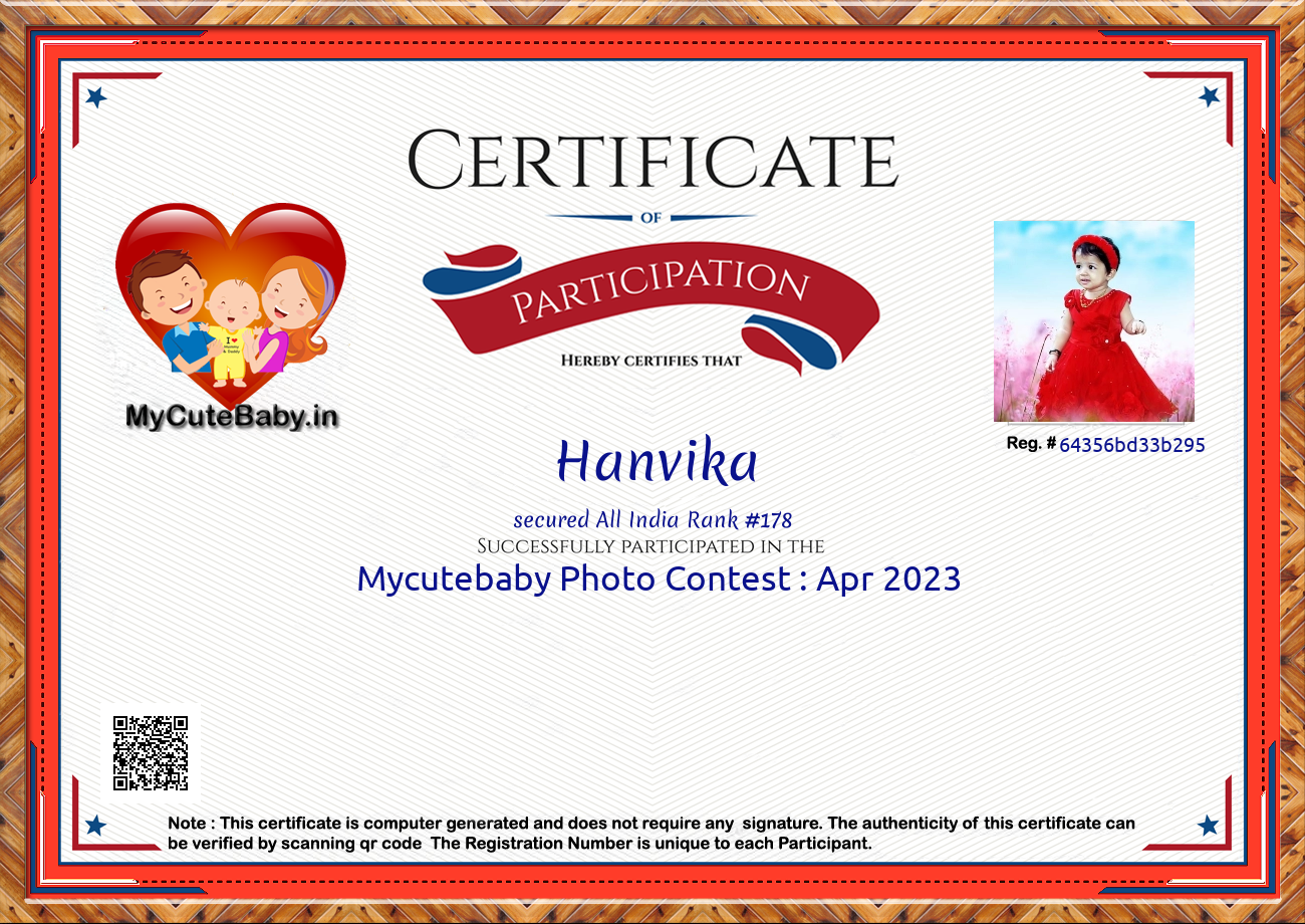 Participation certificate for all the participants whose mycutebaby votes are more than 1000.