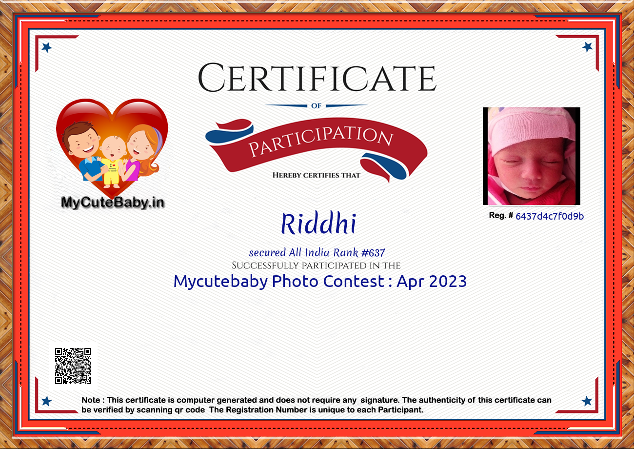 Participation certificate for all the participants whose mycutebaby votes are more than 1000.