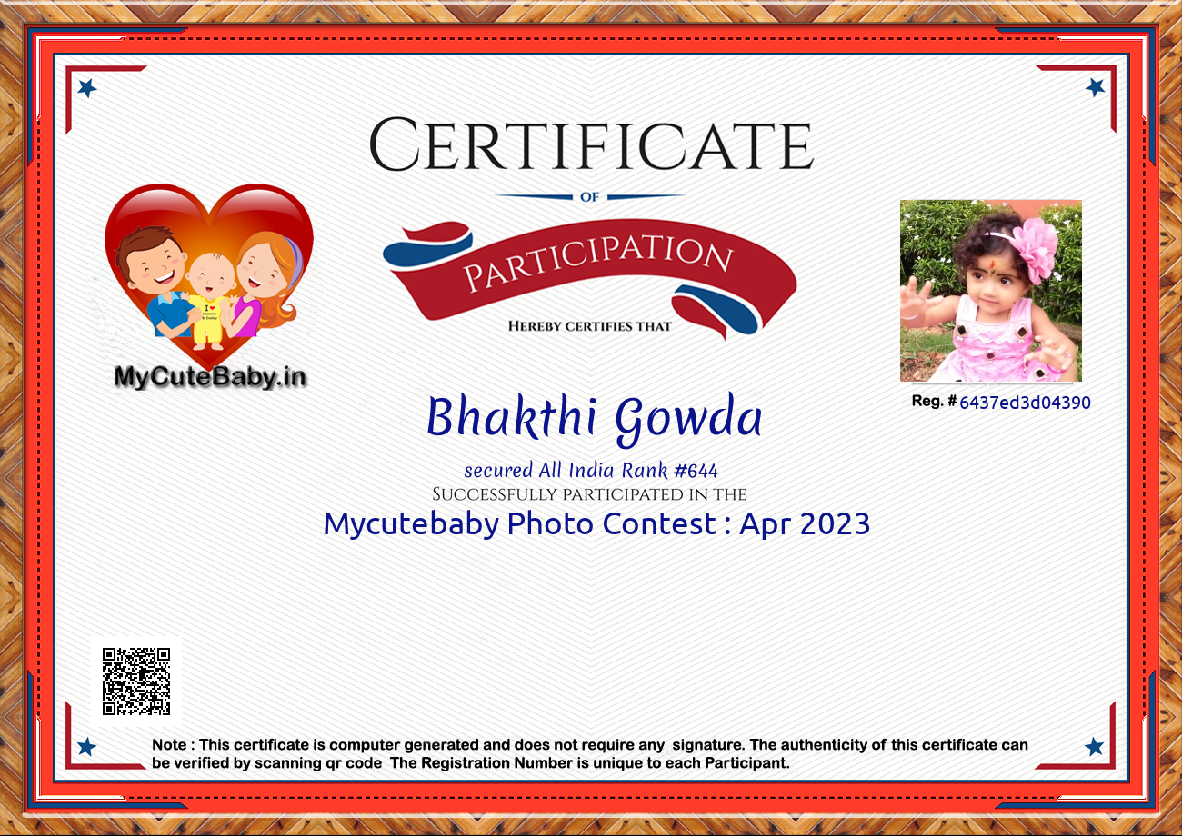 Participation certificate for all the participants whose mycutebaby votes are more than 1000.