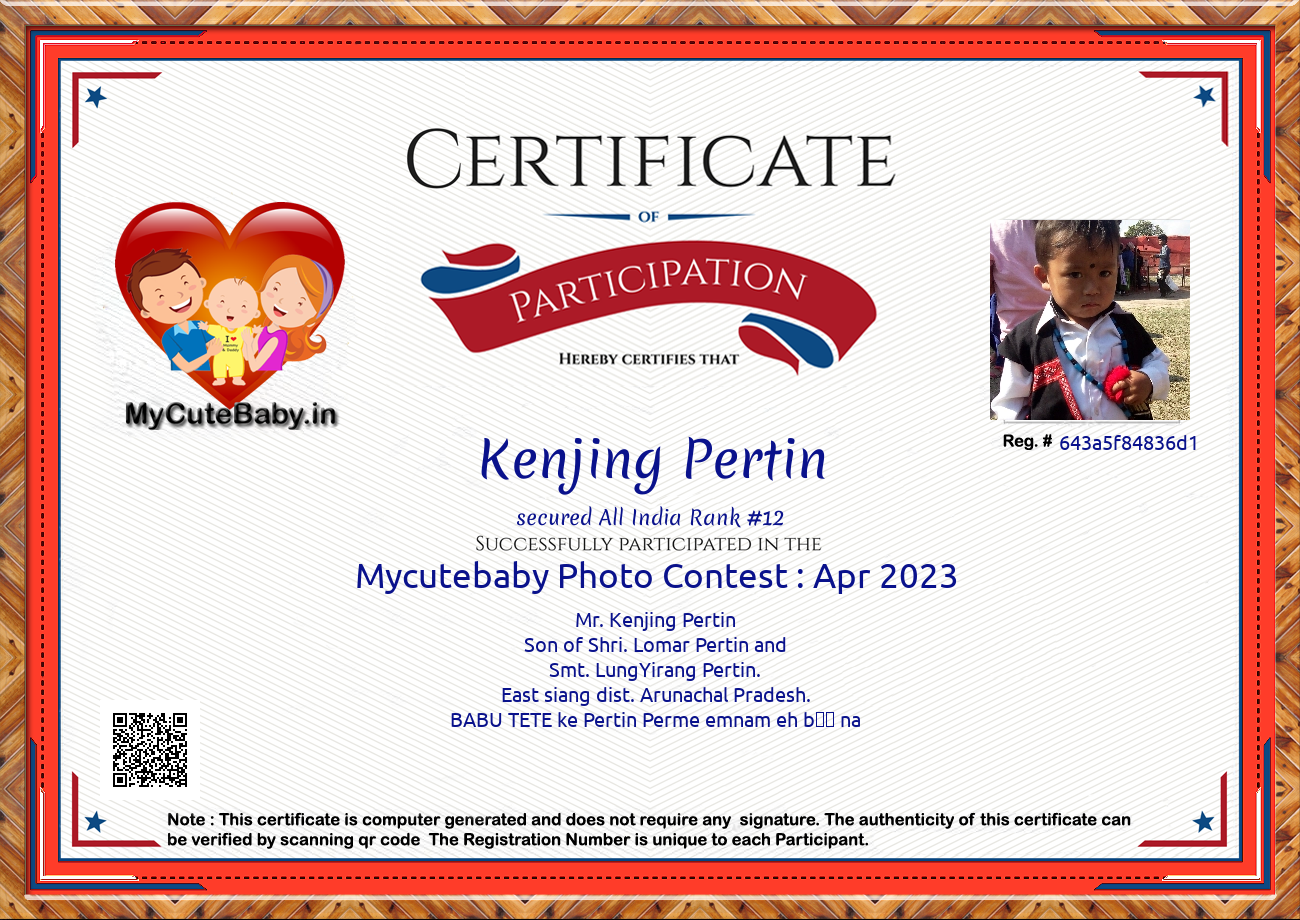 “ Mr. Kenjing Pertin Son of Shri. Lomar Pertin and Smt. LungYirang Pertin. East siang dist. Arunachal Pradesh. BABU TETE ke Pertin Perme emnam eh bíí na ”