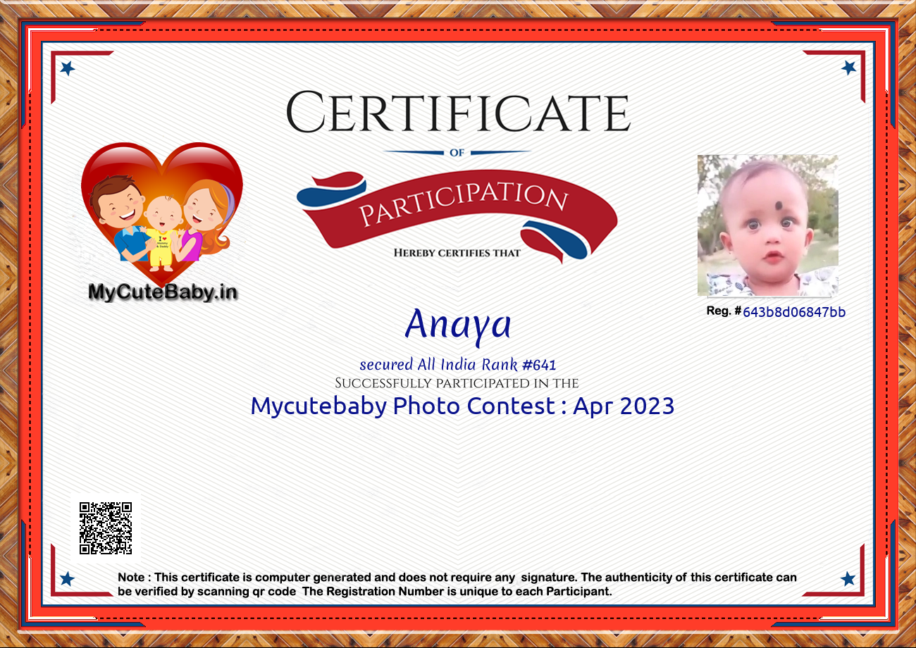 Participation certificate for all the participants whose mycutebaby votes are more than 1000.