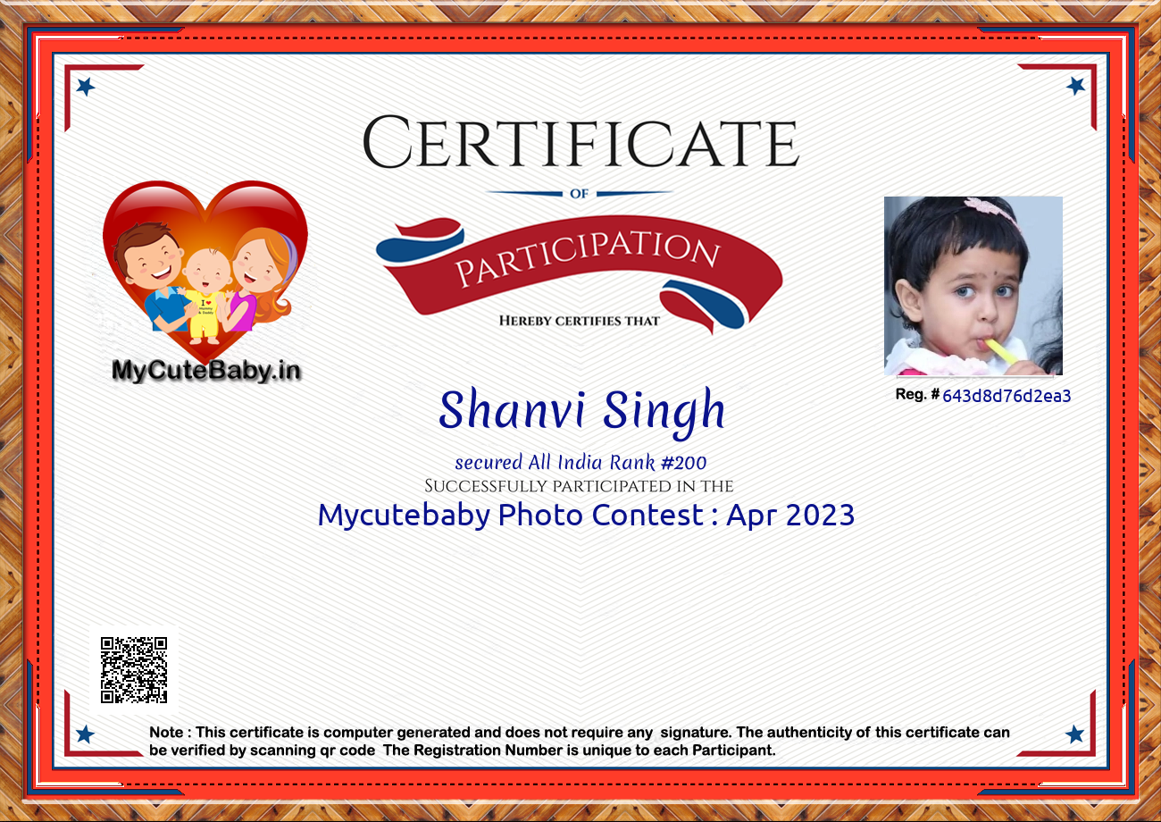 Participation certificate for all the participants whose mycutebaby votes are more than 1000.