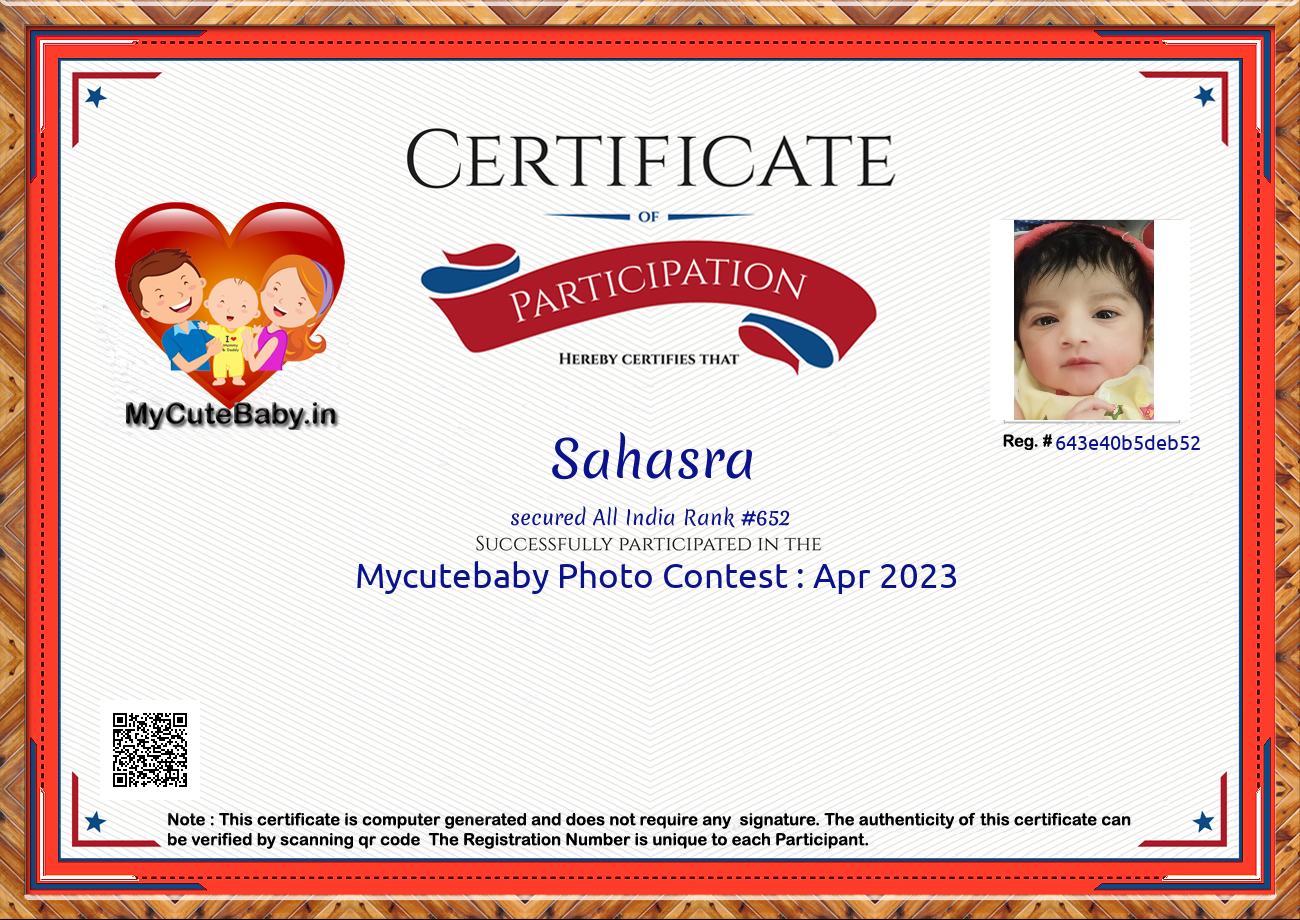 Participation certificate for all the participants whose mycutebaby votes are more than 1000.