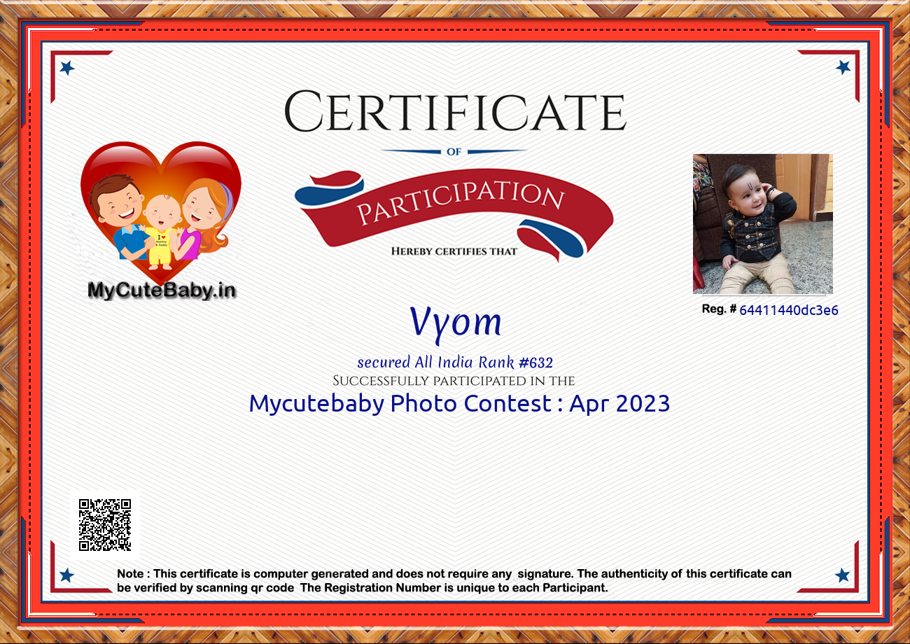 Participation certificate for all the participants whose mycutebaby votes are more than 1000.